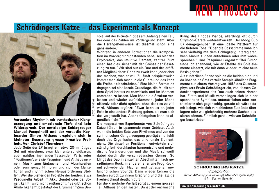 "Ist das noch Jazz oder ist das schon Kunst? Diese Frage stellt sich beim Anhören der neuen EP von SCHRÖDINGERS KATZE immer mal wieder. Und wenn es eines von beiden wäre, warum klingt es dann zuweilen so rockig? Nichts ist handelsüblich bei diesem Duo aus Bern. Schon die Besetzung nicht. Es gibt ein Schlagzeug (bedient von Manuel Pasquinelli, der unter anderem beim Akku Quintett den Takt angibt), und es gibt ein Keyboard (hinter dem Simon Althaus amtet). Mehr ist da nicht. Wenn diese beiden aufeinandertreffen, entsteht eine Musik, die mal groovt, mal für atmosphärische Spannungen sorgt. Nennen wir es Science-Fiction-Pop für eine untergegangene, aber irgendwie immer noch schöne Welt."